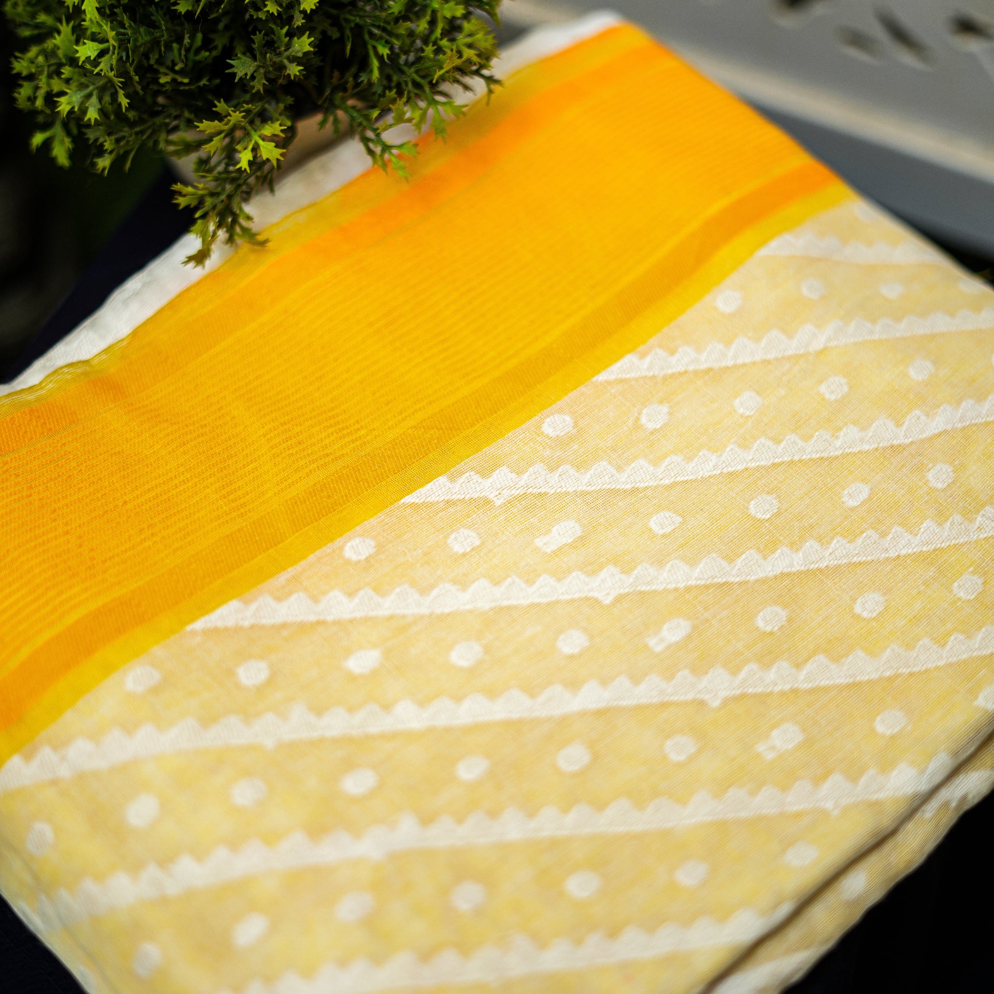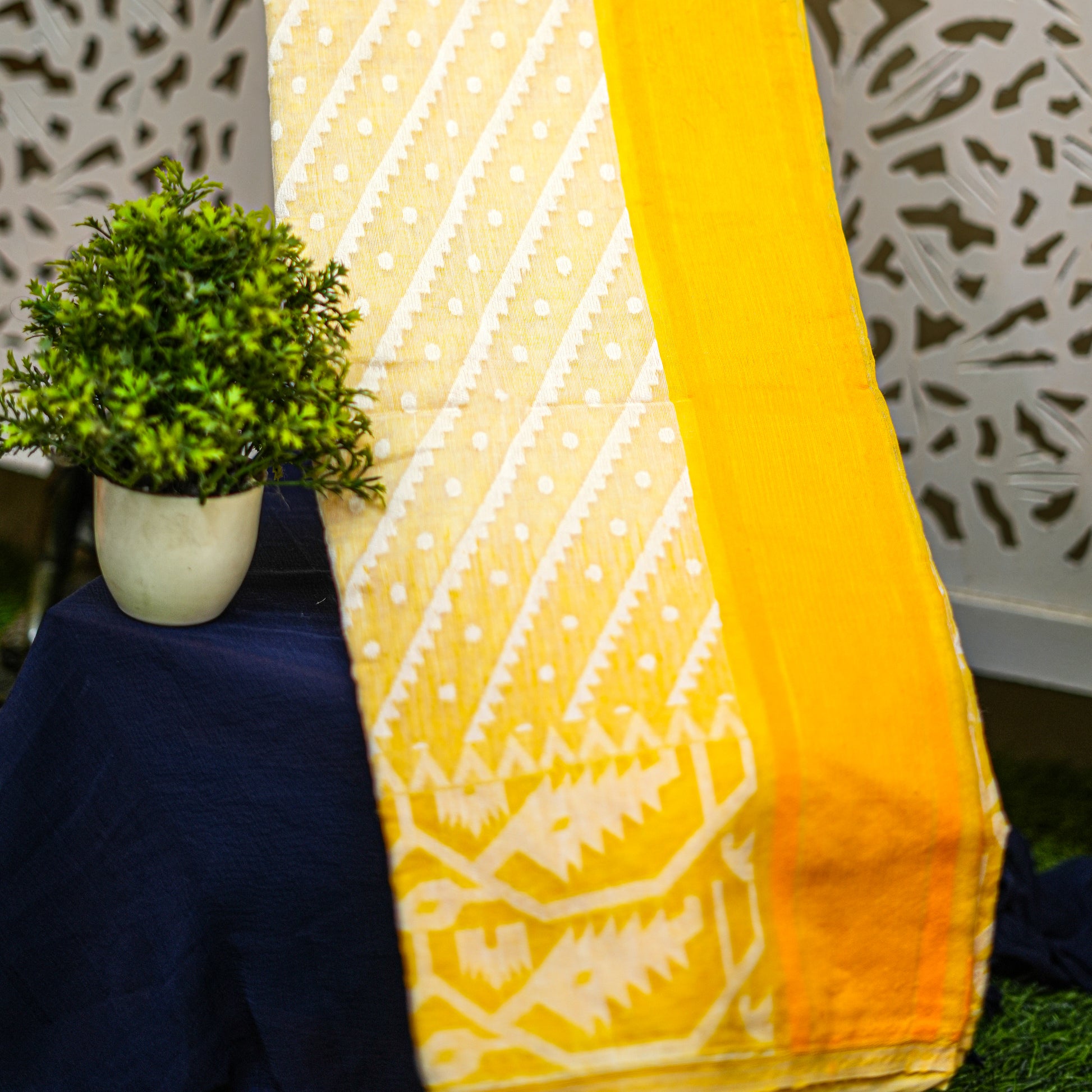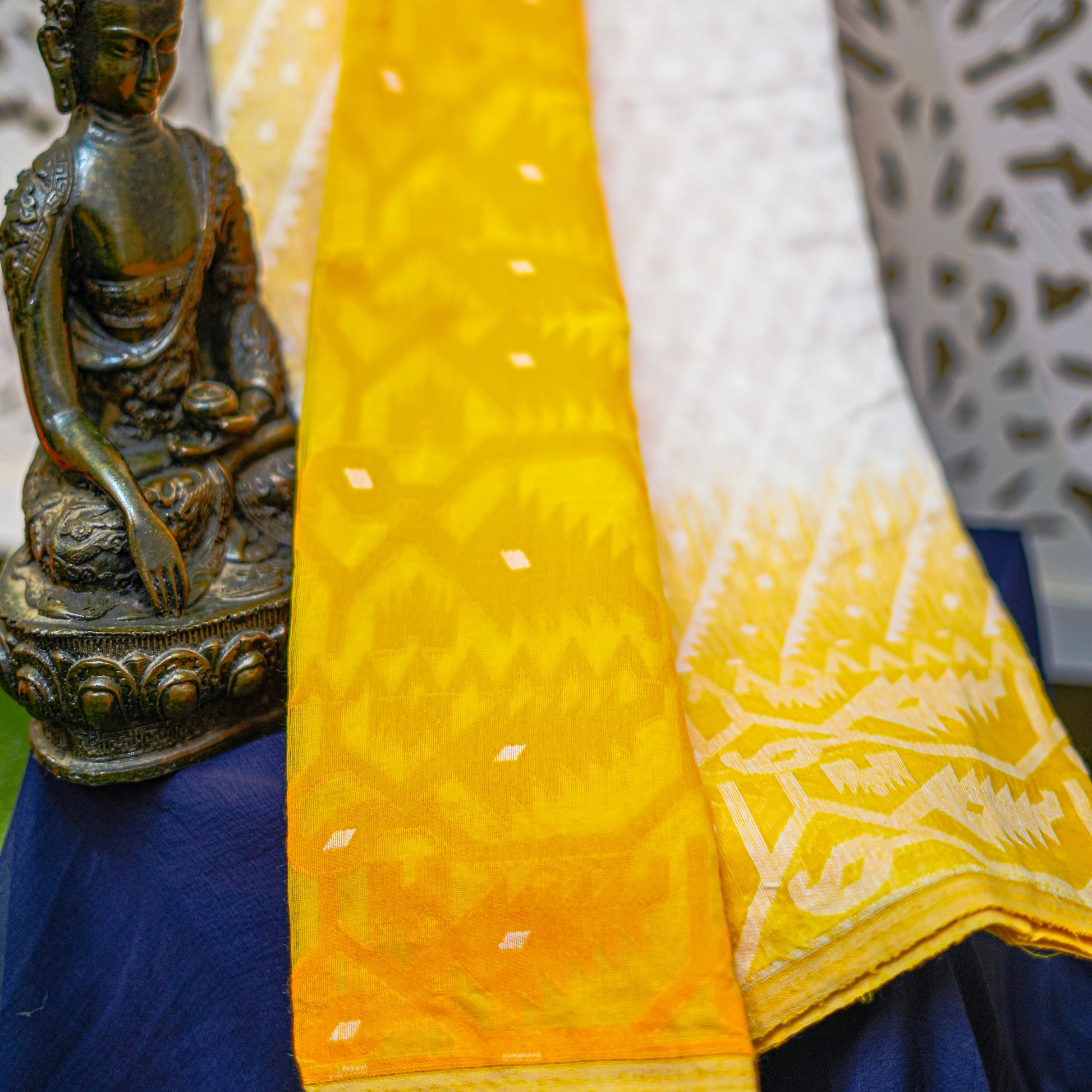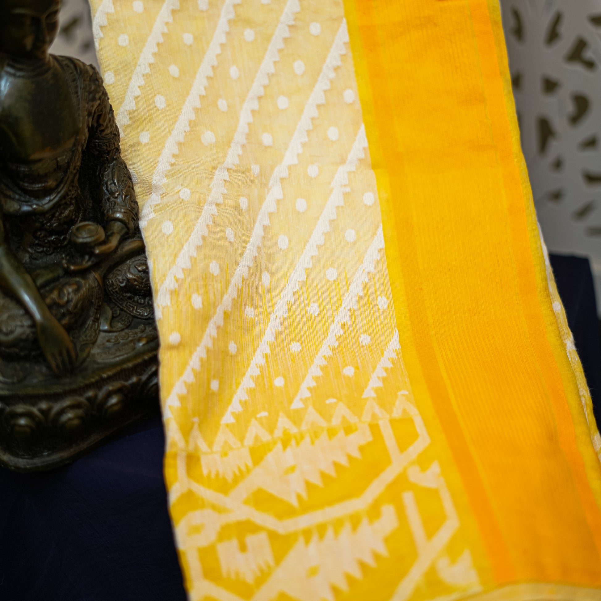 An ultra-fine Korar base delicately punctuated with hand-inserted Jamdani motifs, woven thread by thread to achieve a texture that is airy, intricate, and impossibly precise.